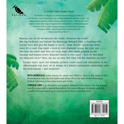 Bumoni can eat all the bananas she wants, whenever she wants! Her big backyard, just outside the Kaziranga National Park, is bursting with banana trees that give the family so much – fruit, flowers, leaves and stems, every bit is used. One night, a herd of wild elephants crosses the river and discovers the trees! And they are back, night after night, gorging on the bananas and banana leaves. Bumoni’s family is very upset – how do they keep the elephants away? Then, she has an idea! But what will the elephants eat now?